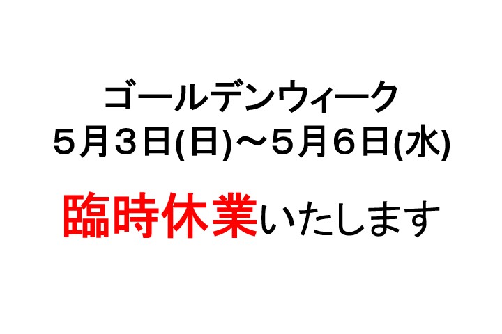5月3日(日)〜5月6日(水)の期間は、誠に勝手ながらお休みさせていただきます。